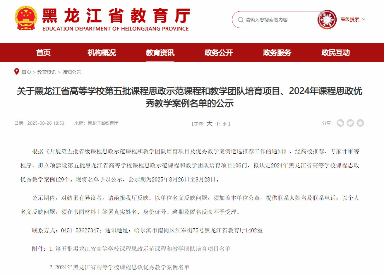 (通讯员 孙志刚 记者 单可欣)近日,黑龙江省教育厅公布第五批黑龙江省高等学校课程思政示范课程和教学团队培育项目及2024年黑龙江省高等学校课程思政优秀教学案例名单,我校《水污染控制工程》等4门课程获批省级课程思政示范课程和教学团队培育项目,5个教学案例获评省级课程思政优秀教学案例,数量位居全省前列,充分彰显学校在课程思政建设领域的创新实践与育人成效。