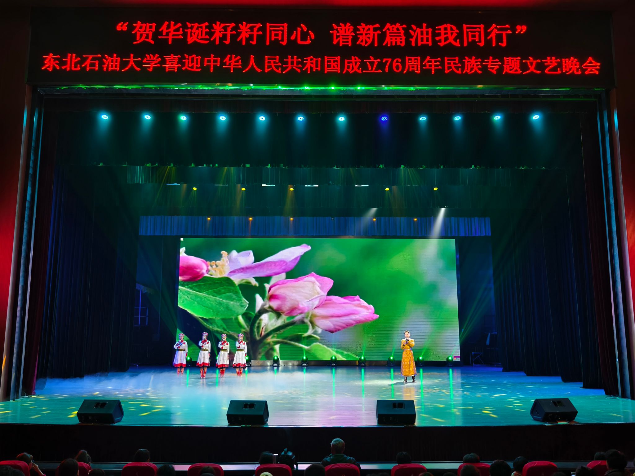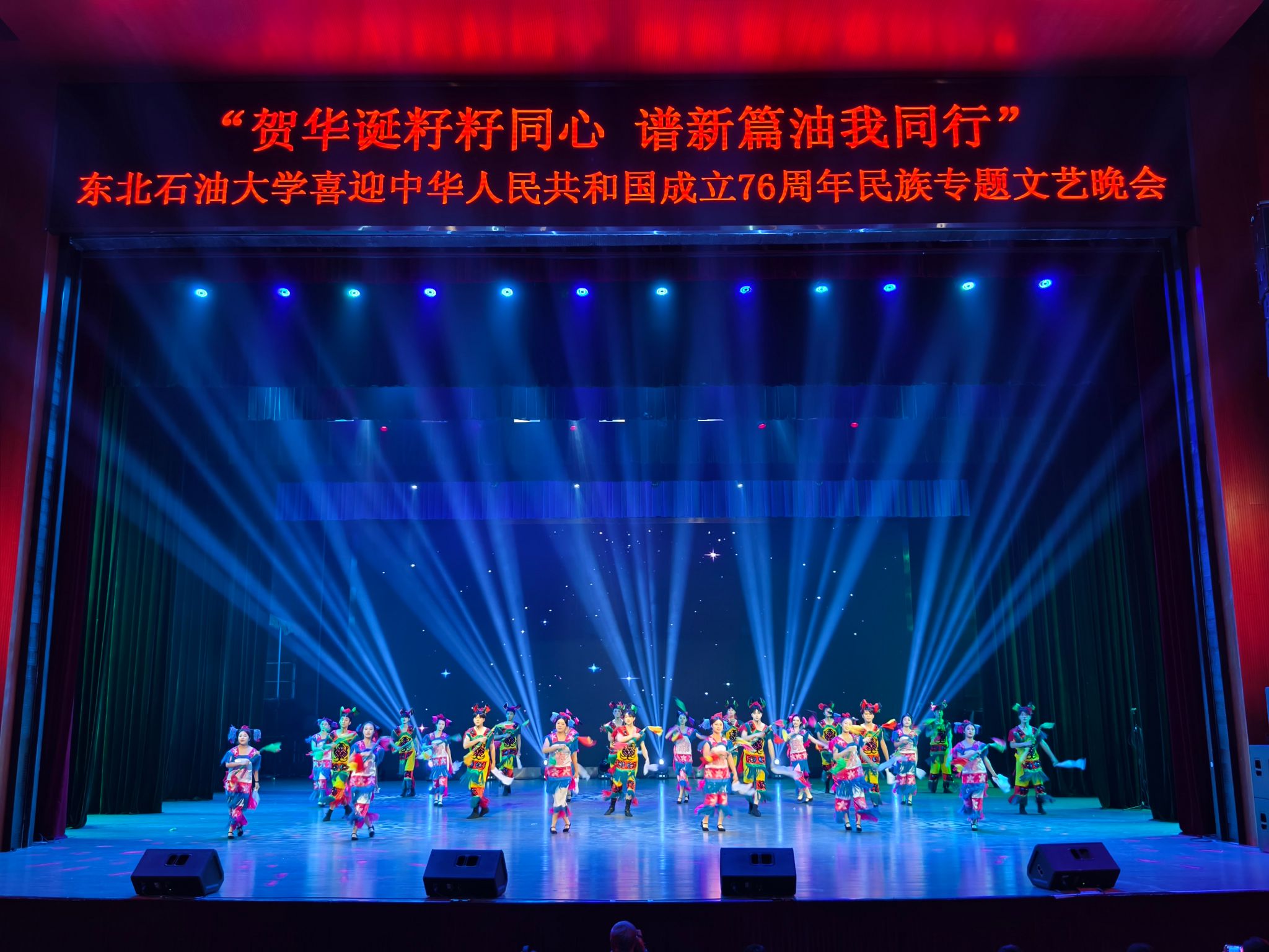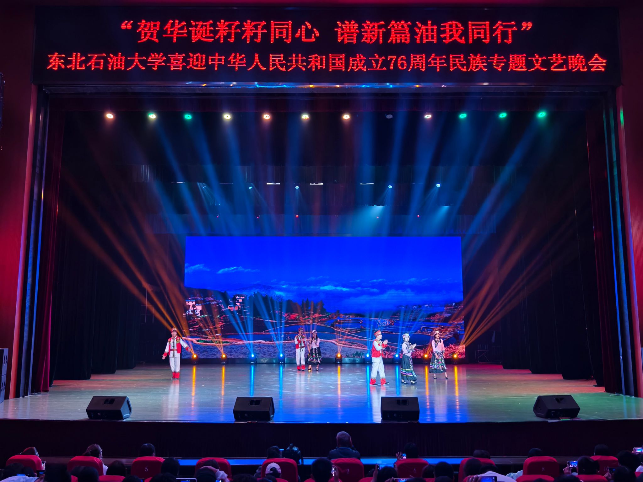 (通讯员 王书婷 记者/摄影 杨雨剑)为庆祝中华人民共和国成立76周年,深化民族团结进步教育,丰富“民族团结进步宣传月”活动内涵,9月27日晚,我校以“贺华诞籽籽同心 谱新篇油我同行”为主题,在音乐厅举办喜迎中华人民共和国成立76周年民族专题文艺晚会。校长董宏丽,校党委常委、组织部部长张智勇,校党委常委、宣传部部长徐清亮出席,校机关及二级学院相关负责人参加。本次晚会由党委统战部主办、大学生艺术团团总支承办、艺术学院协办,全校师生代表欢聚一堂,共赏民族文化盛宴,共话民族团结深情。