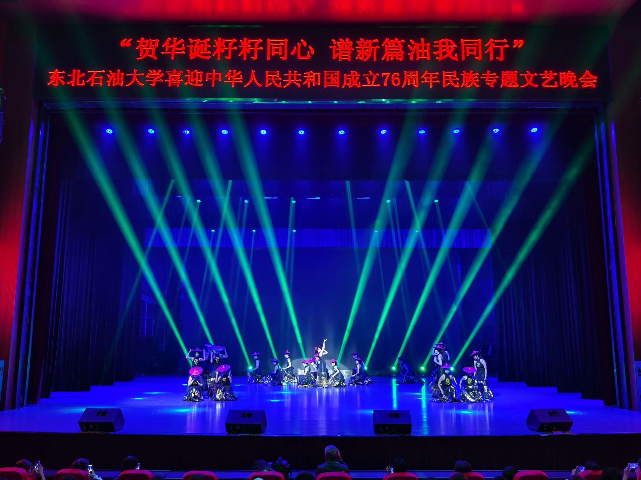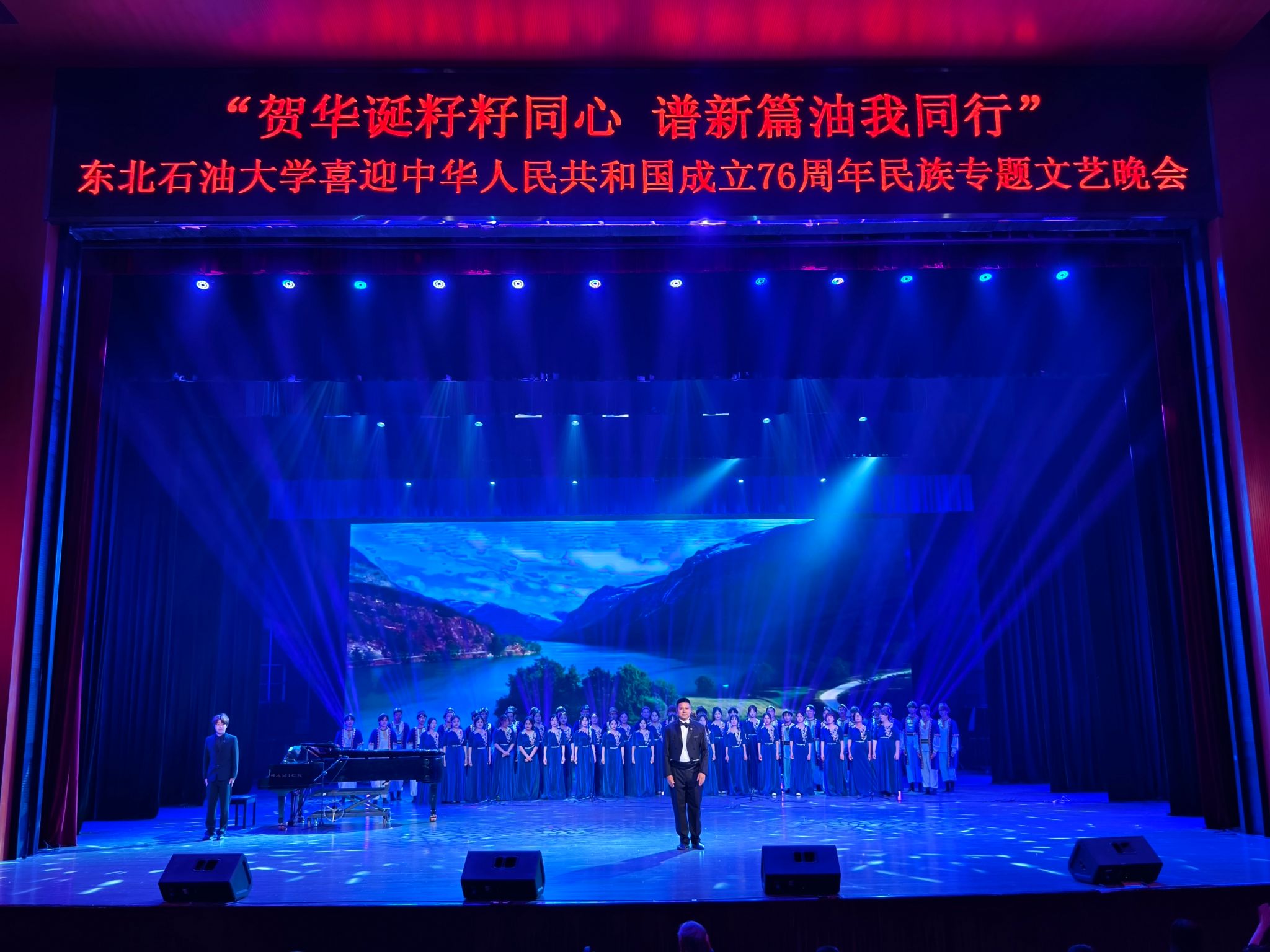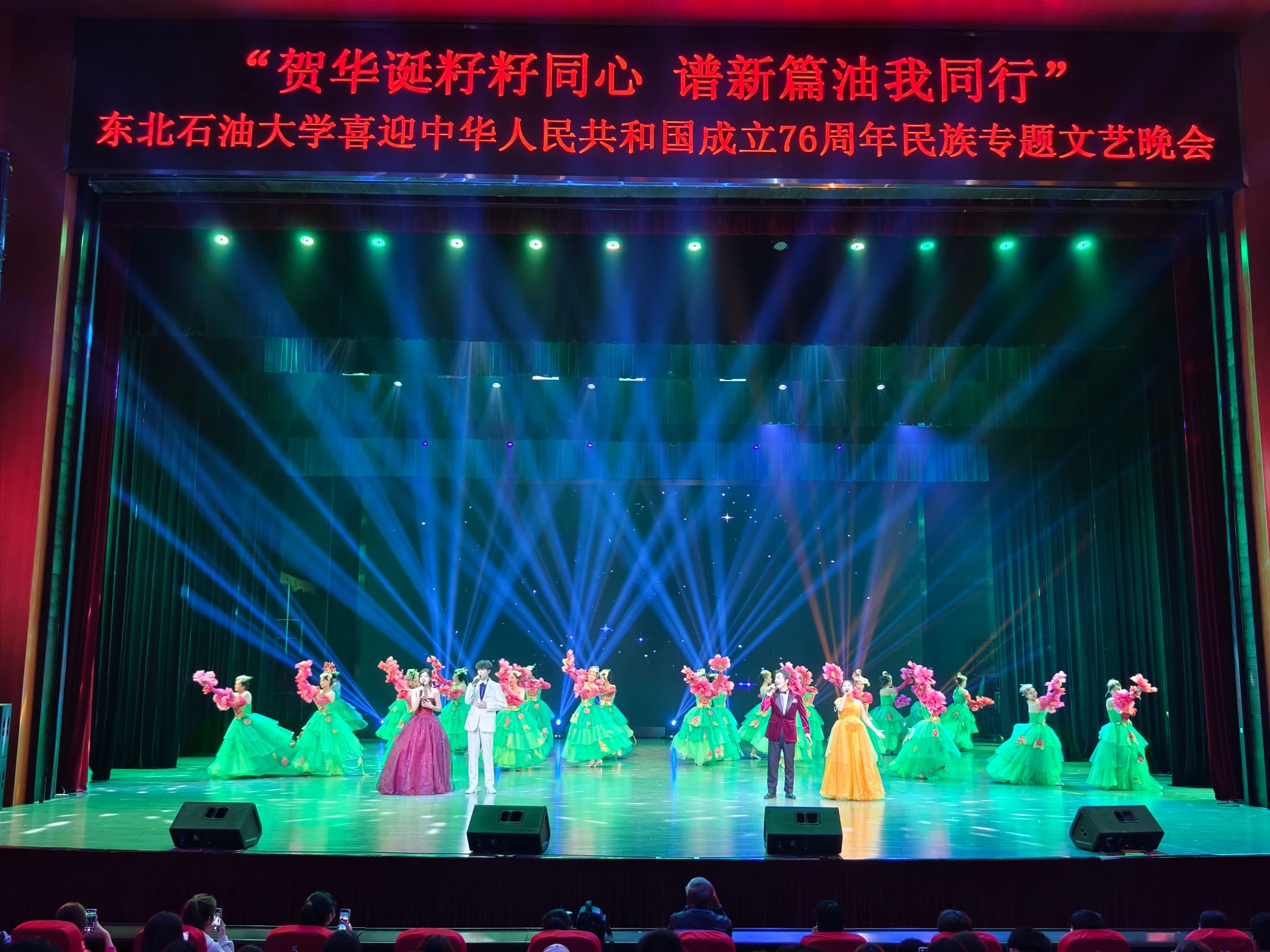 (通讯员 王书婷 记者/摄影 杨雨剑)为庆祝中华人民共和国成立76周年,深化民族团结进步教育,丰富“民族团结进步宣传月”活动内涵,9月27日晚,我校以“贺华诞籽籽同心 谱新篇油我同行”为主题,在音乐厅举办喜迎中华人民共和国成立76周年民族专题文艺晚会。校长董宏丽,校党委常委、组织部部长张智勇,校党委常委、宣传部部长徐清亮出席,校机关及二级学院相关负责人参加。本次晚会由党委统战部主办、大学生艺术团团总支承办、艺术学院协办,全校师生代表欢聚一堂,共赏民族文化盛宴,共话民族团结深情。
