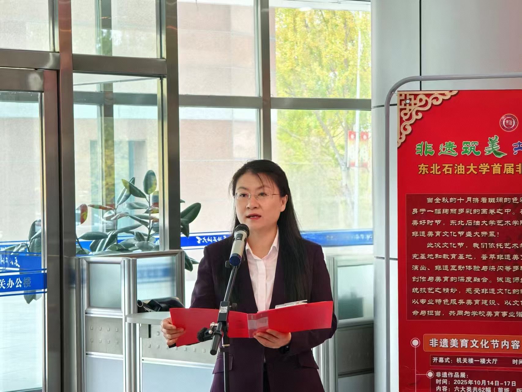 董宏丽致开幕辞。她强调了美育与文化传承在高校育人工作中的重要作用,并指出,东北石油大学始终以“五育并举”为指引,将大庆精神融入美育全过程,显著提升了学生的审美情趣与人文素养,实现了多样化全覆盖具有非遗特色的东油美育格局,推进了美育校园文化建设。