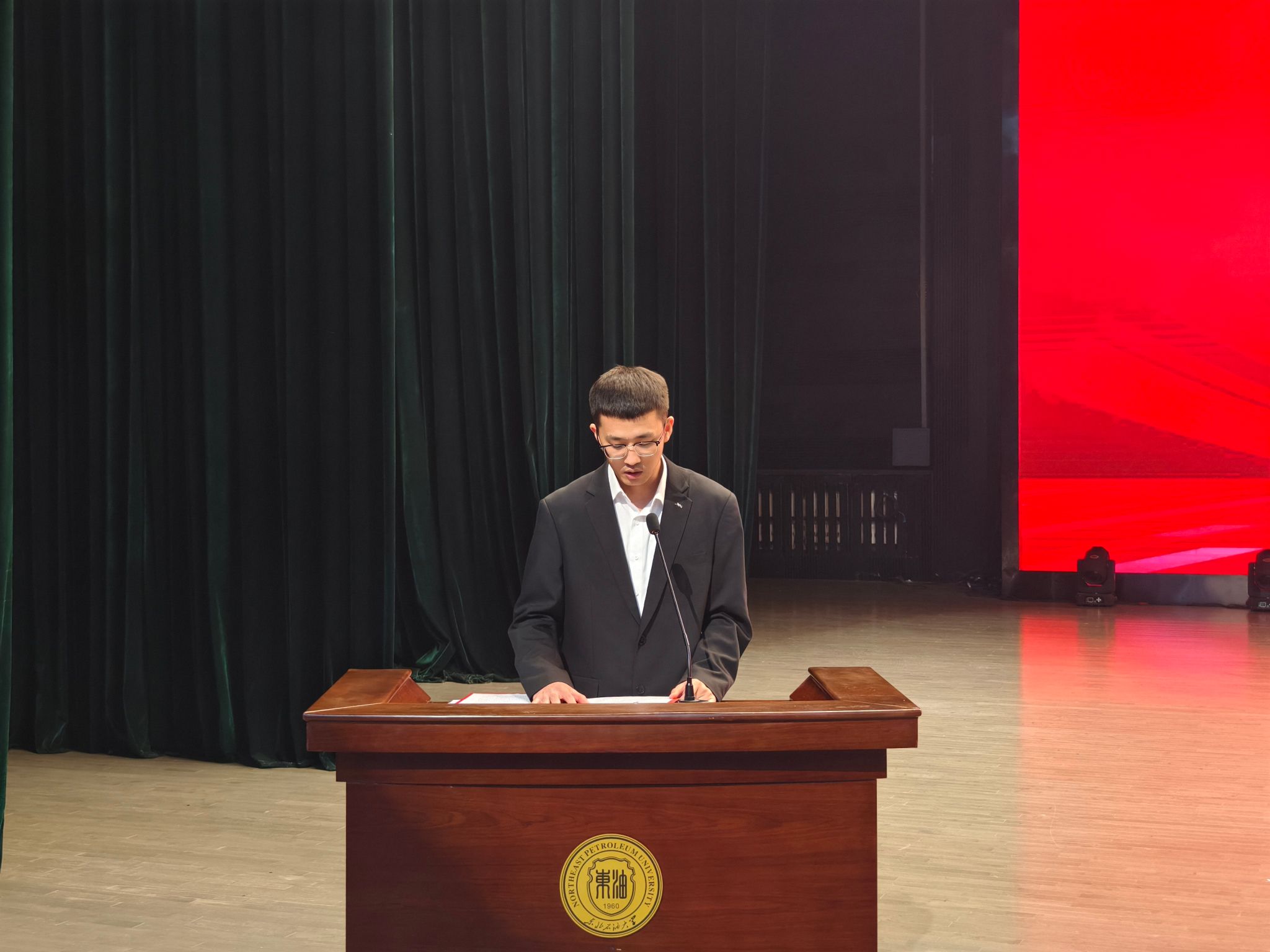 专业实践杰出奖获奖代表、石油工程学院硕士研究生牛赵钱,优秀学术报告奖获奖代表、新能源与材料学院博士研究生乔志强在闭幕式上作经验分享。