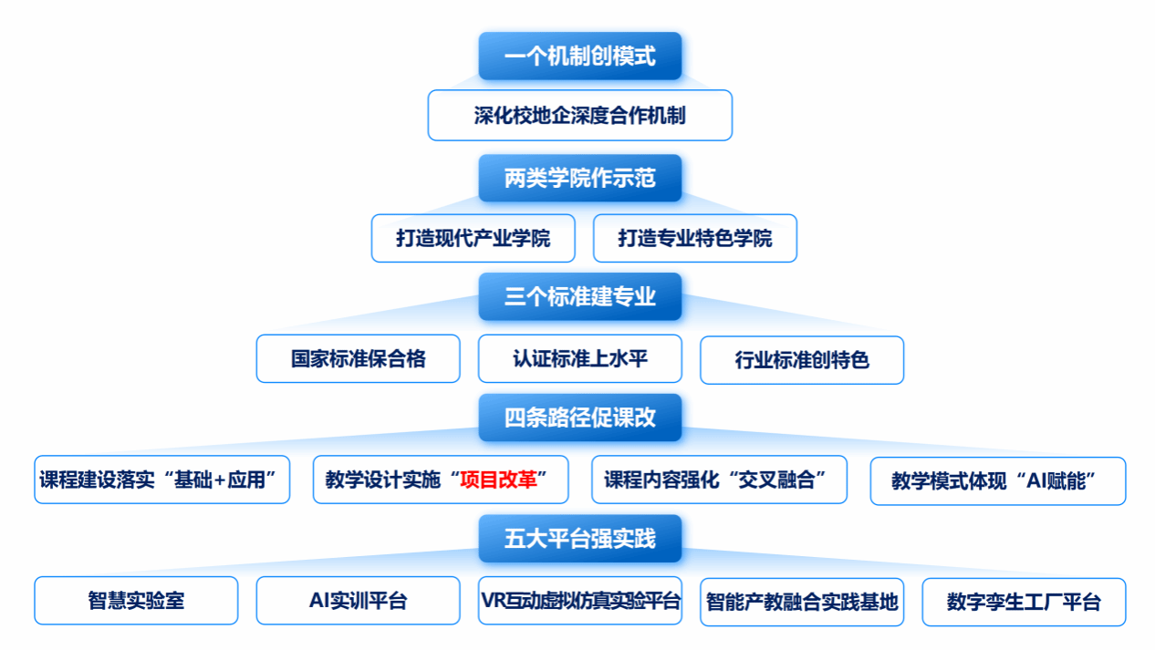 四个对接深化产教融合。打造“13235”产教融合培养体系,获批5个省级现代产业学院建设点、省级高等教育综合改革试点及644项教育部产学合作协同育人项目。