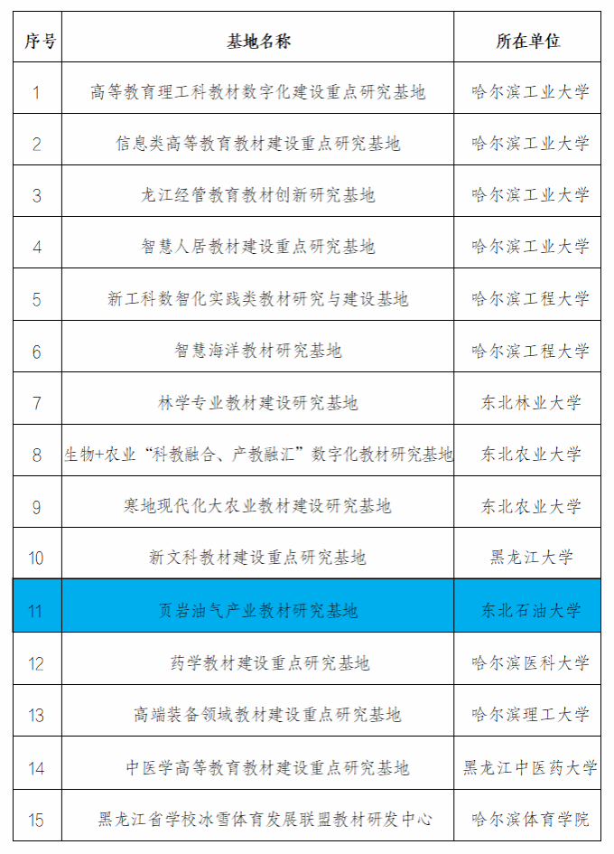 (通讯员 孙志刚 记者 单可欣)近日,黑龙江省教育厅发布2025年黑龙江省高等教育教材建设重点研究基地名单,我校组织申报的“页岩油气产业教材研究基地”入选,成为2025年全省认定的15个省级教材建设重点研究基地之一。