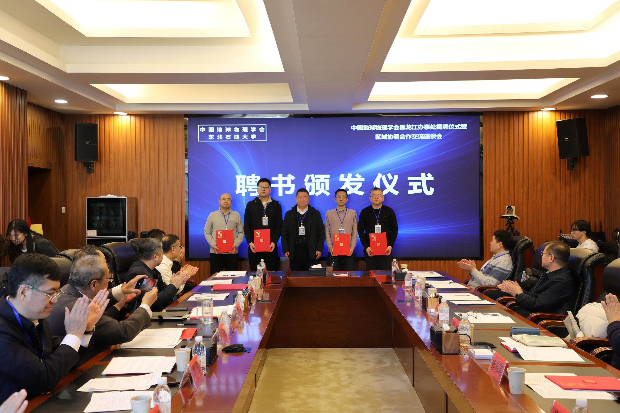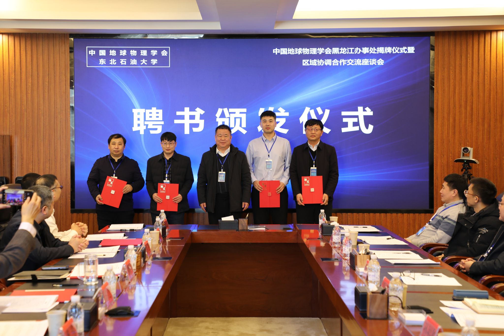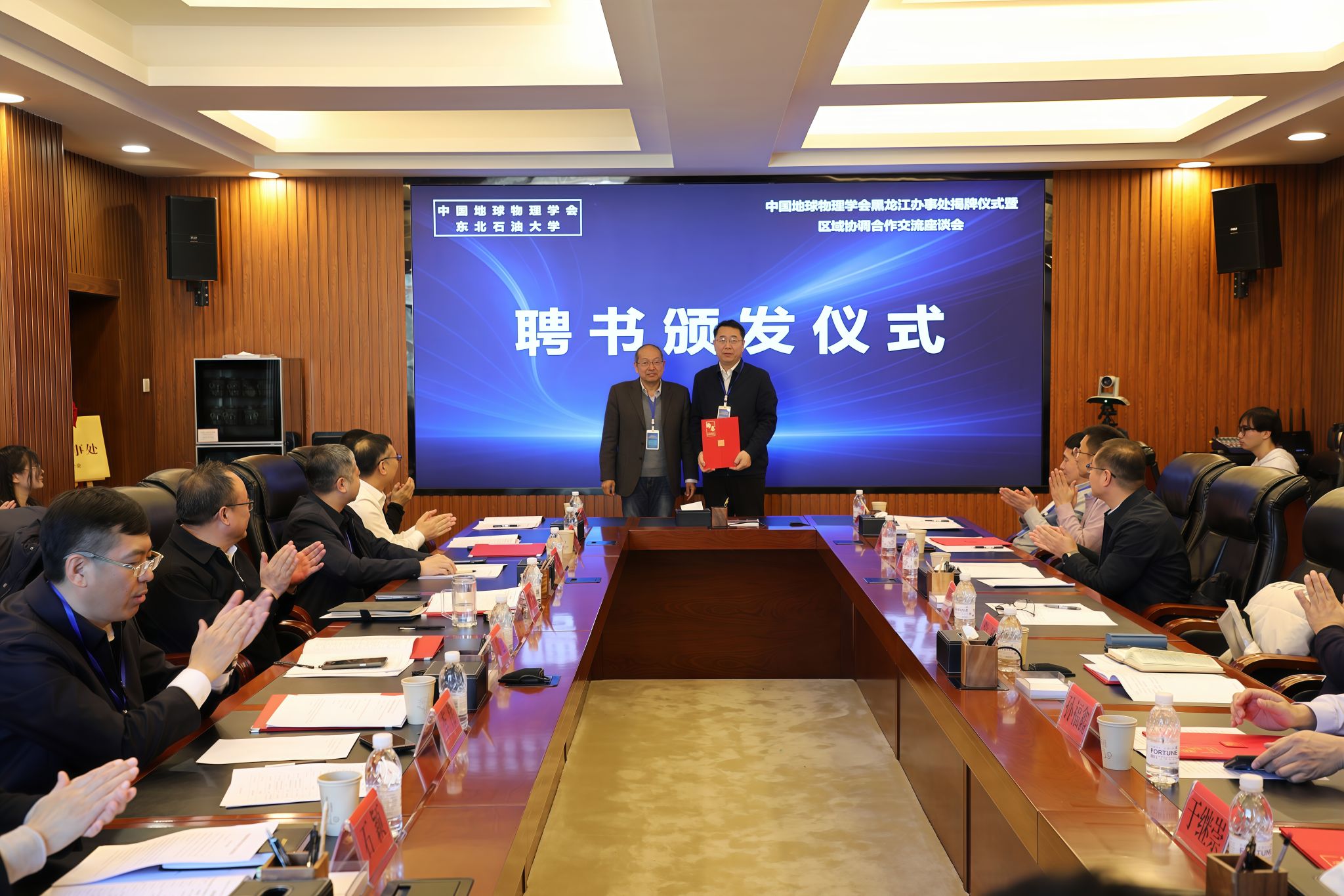 在聘任仪式环节,大庆市科学技术协会主席董立峰为黑龙江省地震局震灾风险防治中心主任常征、黑龙江省地球物理地球化学勘查院科技创新主任闫浩、黑龙江省齐齐哈尔地质勘查院副院长孙福鑫、大庆油田勘探开发研究院副院长赵海波、中国石油集团测井有限公司大庆分公司经理于继崇、哈尔滨工业大学数学学院于四伟教授、黑龙江科技大学矿业工程学院商宇航教授、黑龙江工程学院测绘工程学院王强教授、我校地球科学学院王宁教授九位办事处副主任颁发聘书,郭建为办事处主任、我校王维红教授颁发聘书,为办事处后续规范运作奠定组织基础。