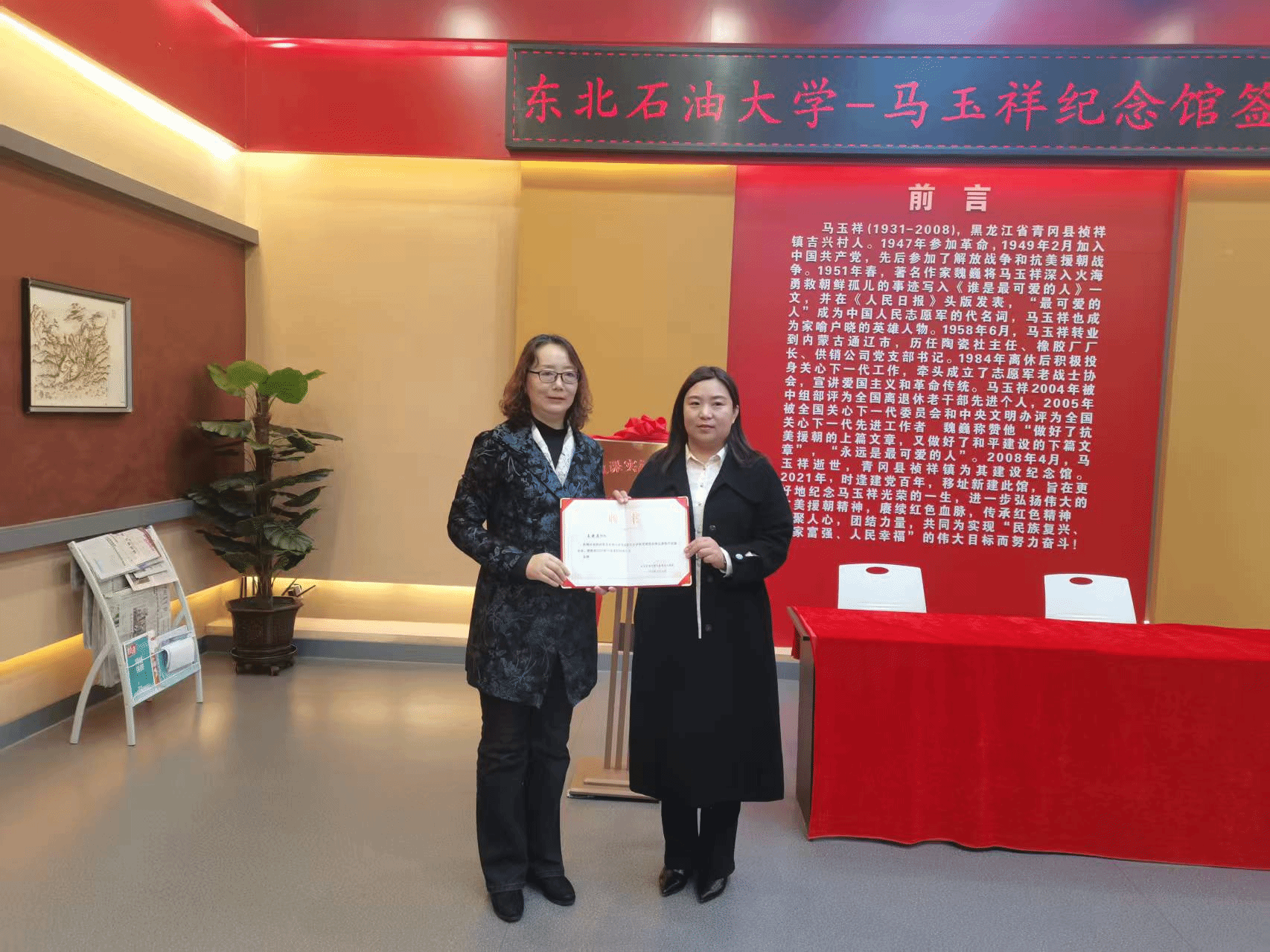 签约仪式现场,王鹤岩聘请青冈县马玉祥博物馆馆长王晓庆、副馆长白玛央金担任我校思政课实践导师并颁发聘书。签约仪式后,白玛央金引领众人寻迹“最可爱的人”——马玉祥老人。白玛央金通过陈列的实物、图片、文字、主题雕塑及3D复原的场景再现了马玉祥在松骨峰战斗、勇救朝鲜儿童的光辉事迹。马玉祥荣归转业地方后,依然隐姓埋名支援边疆、守卫祖国海空。中国当代作家、诗人魏巍称赞他“做好了抗美援朝的上篇文章,又做好了和平建设的下篇文章,永远是最可爱的人”。