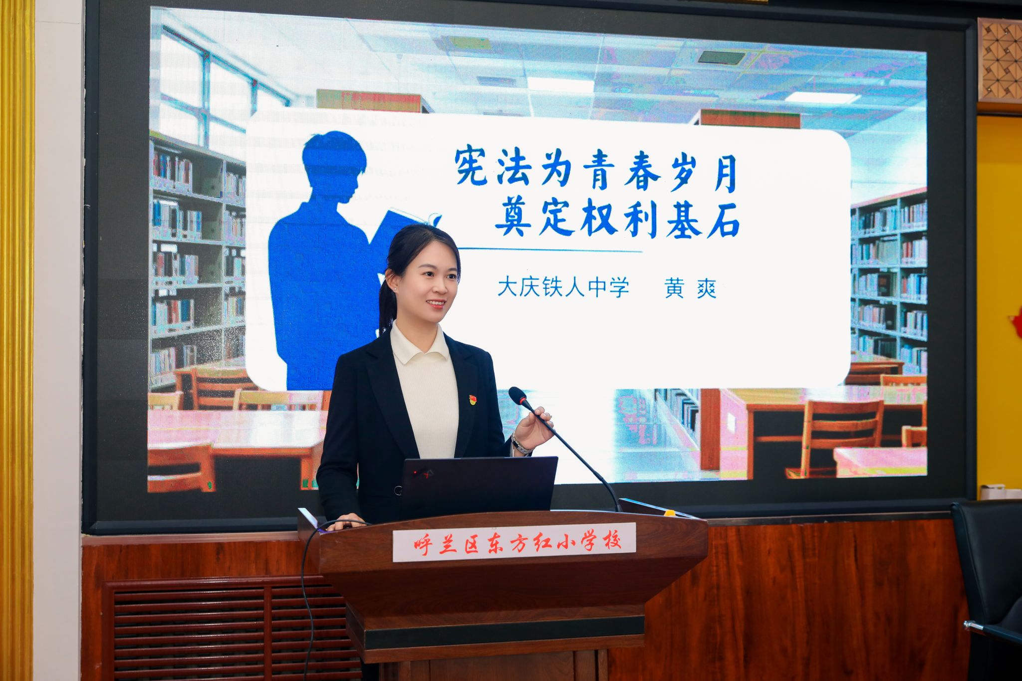 活动中,小学学段由哈尔滨市呼兰区东方红小学校教师蔡景玲以《国旗与国徽的小故事》为题授课,初中学段由哈尔滨市呼兰区第四中学校教师于校涵以《宪法中的“权力”与“权利”》为题授课,高中学段由大庆铁人中学教师黄爽以《宪法为青春岁月奠定权利基石》为题授课,大学学段由我校教师陈延华以《坚持系统观念:挖掘宪法精神与大庆精神(铁人精神)的契合点》为题授课。