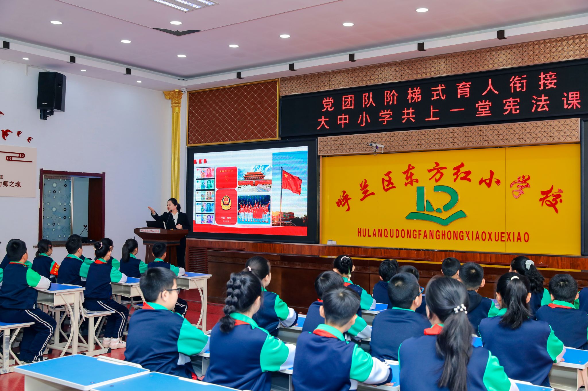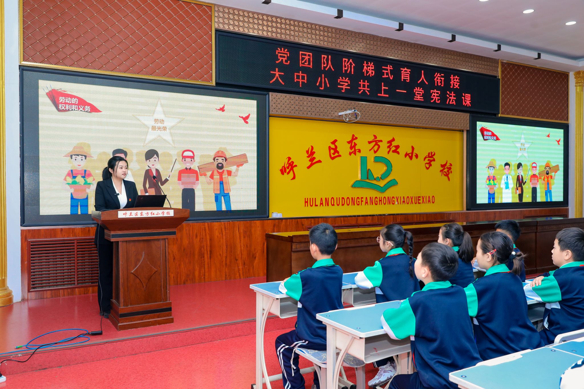 本次活动最大亮点在于成功贯通“小-初-高-大”四个学段,通过宪法“同课异构”实现同一主题在不同学段呈现阶梯式表达,小学学段讲解国旗与国徽小故事,使小学生了解宪法基本知识;初中学段讲解宪法第二章与第三章的基本内容,使初中生构建起宪法的知识框架;高中学段讲解民法典、劳动法对宪法的具体落实,深化高中生对“宪法是国家根本法”的认识;大学学段挖掘宪法精神与大庆精神(铁人精神)的契合点,教育引导青年学生为以中国式现代化全面推进中华民族伟大复兴贡献青春力量。通过四个学段分层递进的教学设计、授课主题深度衔接,构建“党-团-队”一体化阶梯式育人链条。