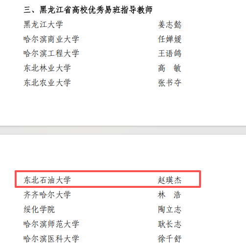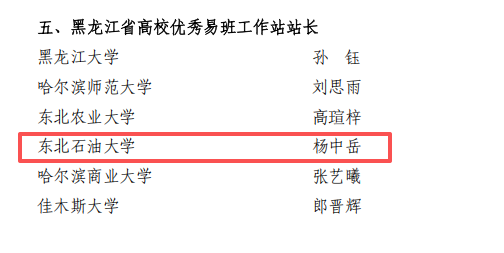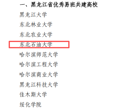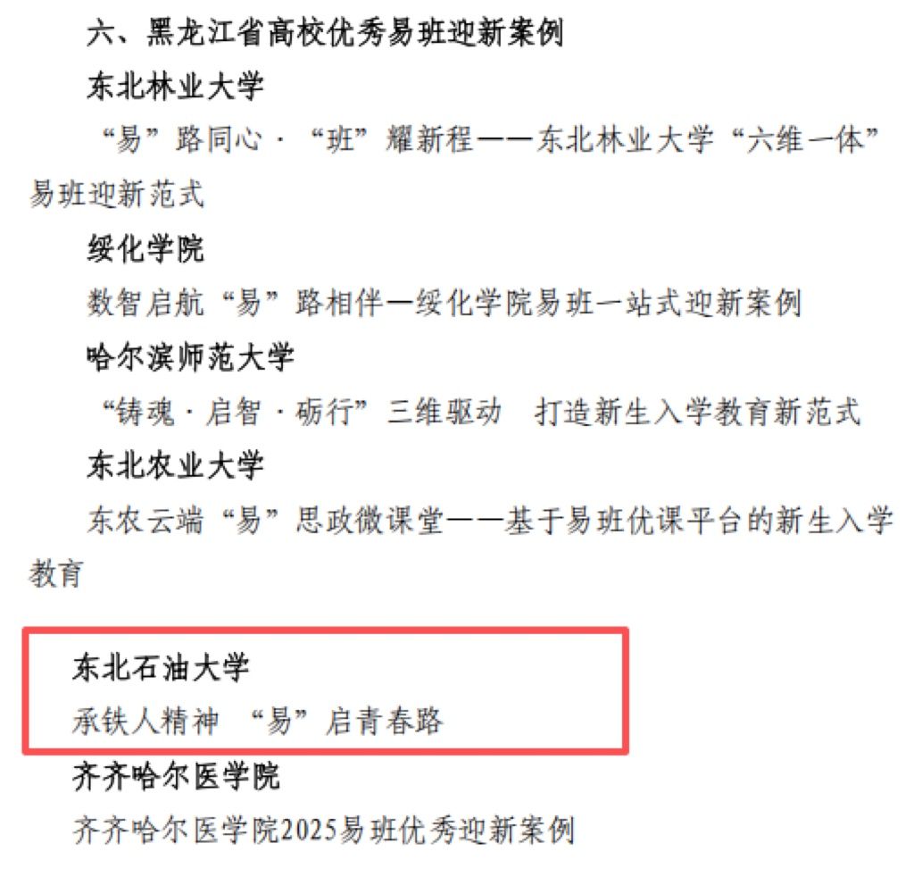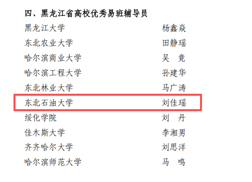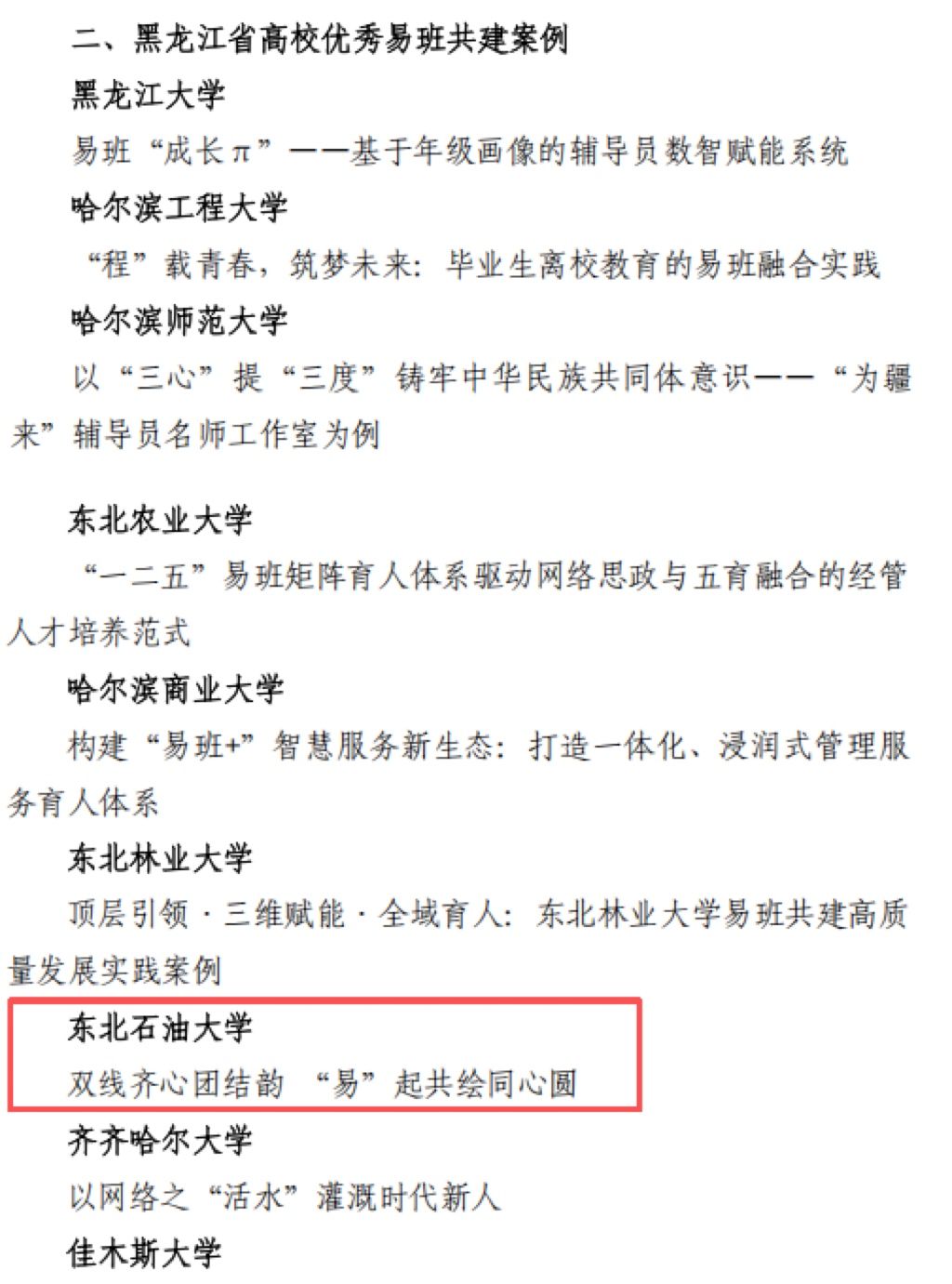 评选中,我校荣获“黑龙江省优秀易班共建高校”;“双线齐心团结韵‘易’起共绘同心圆”工作案例获评“黑龙江省高校优秀易班共建案例”;学生工作部学生思想教育科赵瑛杰获评“黑龙江省高校优秀易班指导教师”;机械科学与工程学院刘佳瑶获评“黑龙江省高校优秀易班辅导员”;石油工程学院油(采收率)231班杨中岳获评“黑龙江省高校优秀易班工作站站长”;“承铁人精神‘易’启青春路”迎新案例获评“黑龙江省高校优秀易班迎新案例”。