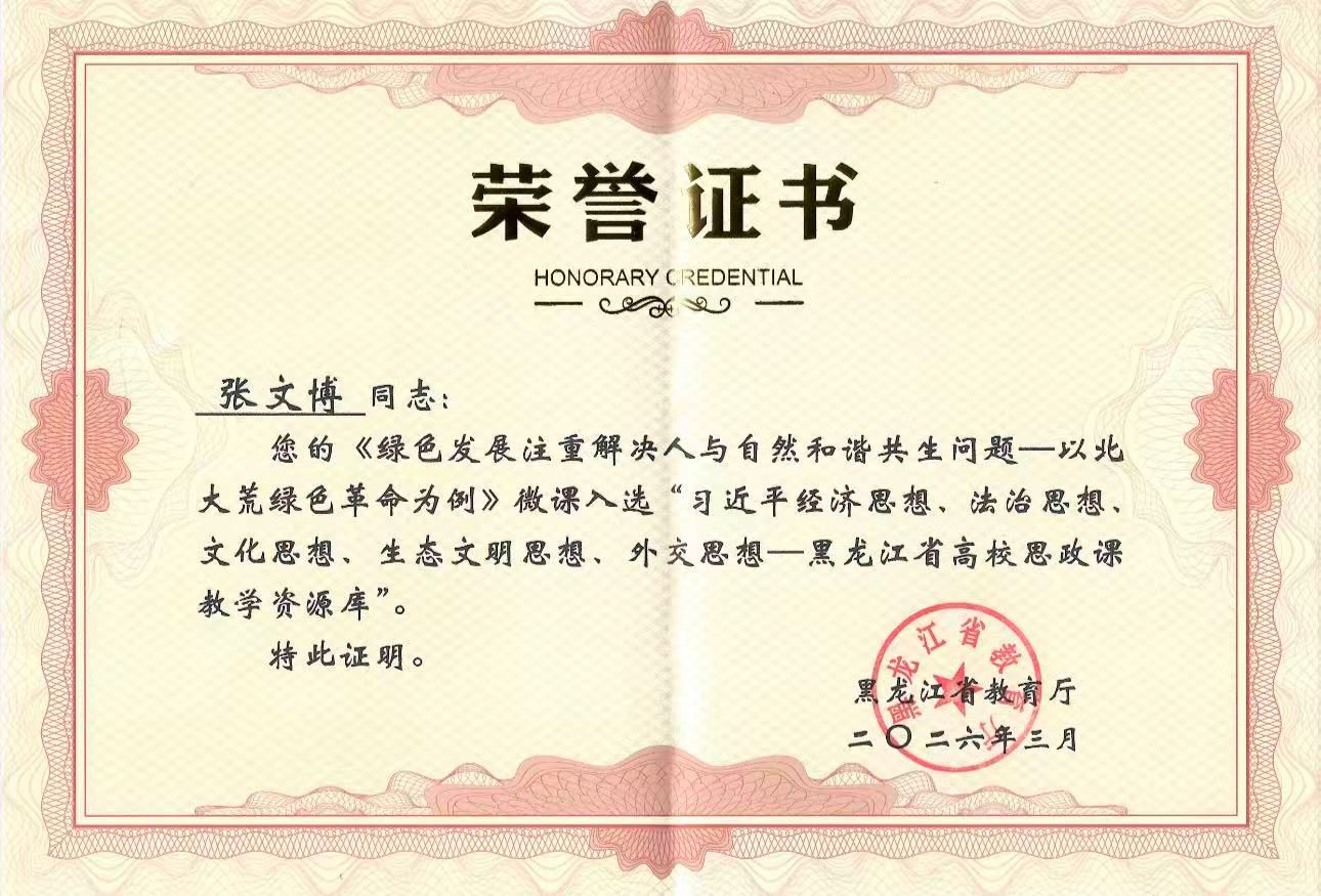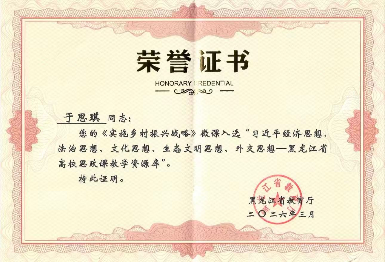 (记者 周宏)近日,黑龙江省教育厅公布最新一批高校思政课教学案例库入选名单。马克思主义学院教师王中蕾、于思琪、张文博主讲的微课《我国发展仍然处于重要战略机遇期》《实施乡村振兴战略》《绿色发展注重解决人与自然和谐共生问题——以北大荒绿色革命为例》入选“习近平经济思想、法治思想、文化思想、生态文明思想、外交思想——黑龙江省高校思政课教学资源库”。