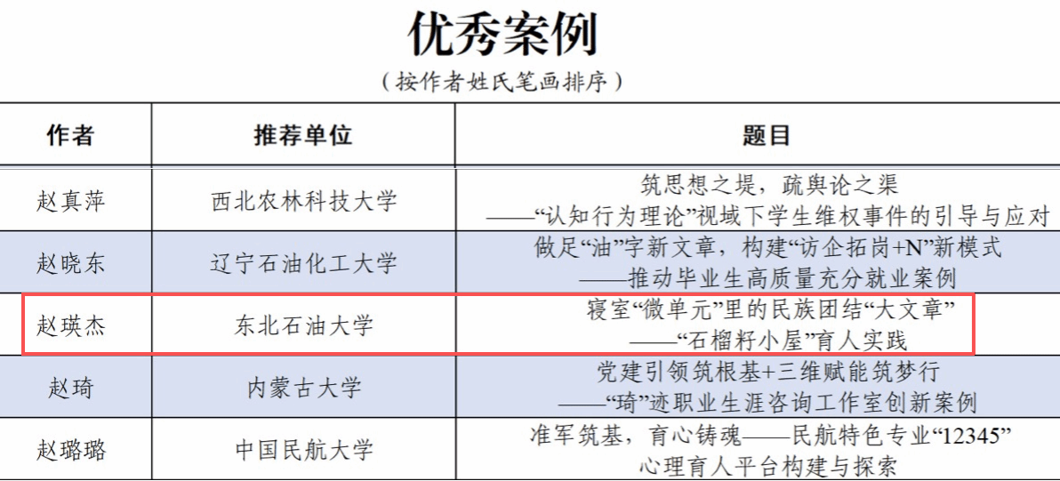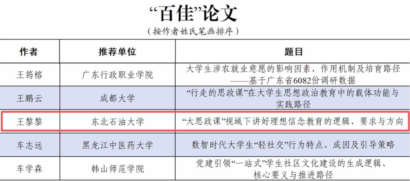 (通讯员 安子怡  记者 周宏)近日,教育部高校思想政治工作队伍培训研修中心(山东大学)、《高校辅导员》编辑部公布了2025年高校思想政治工作优秀文章征集活动评选结果。马克思主义学院党委副书记王黎黎撰写的《“大思政课”视域下讲好理想信念教育的逻辑、要求与方向》入选“百佳”论文,学生工作部学生思想教育科科长赵瑛杰撰写的《寝室“微单元”里的民族团结“大文章”——“石榴籽小屋”育人实践》入选“优秀案例”。