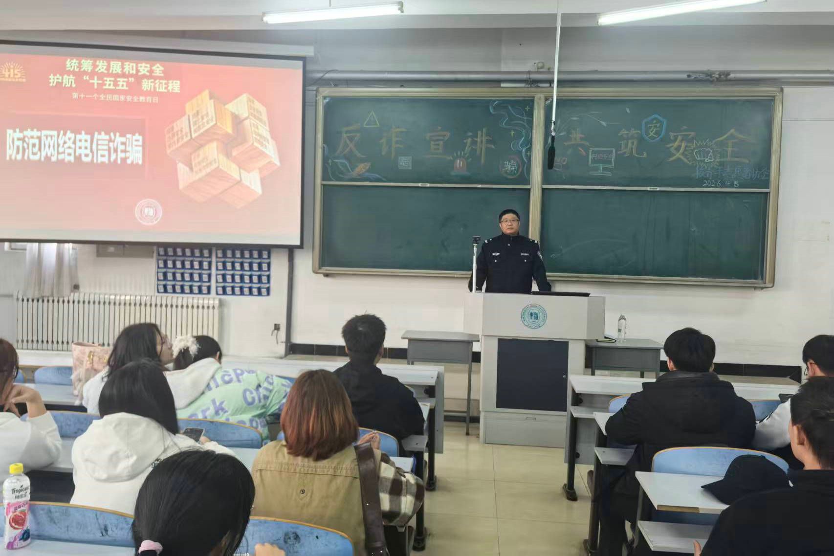 (通信员 孟庆彪  记者 周宏)在第十一个全民国家安全教育日到来之际,为深入贯彻落实总体国家安全观,切实增强广大师生防范电信网络诈骗的意识和能力,筑牢校园安全防线,4月15日下午,由保卫处牵头,联合校青年志愿者协会共同组织的“反诈宣传进校园,守护安全第一线”主题宣讲活动在1H410教室举行。本次活动邀请黎明派出所教导员田海军作专题宣讲,全校各班级学生干部、校青年志愿者协会骨干成员共计200余人参加。